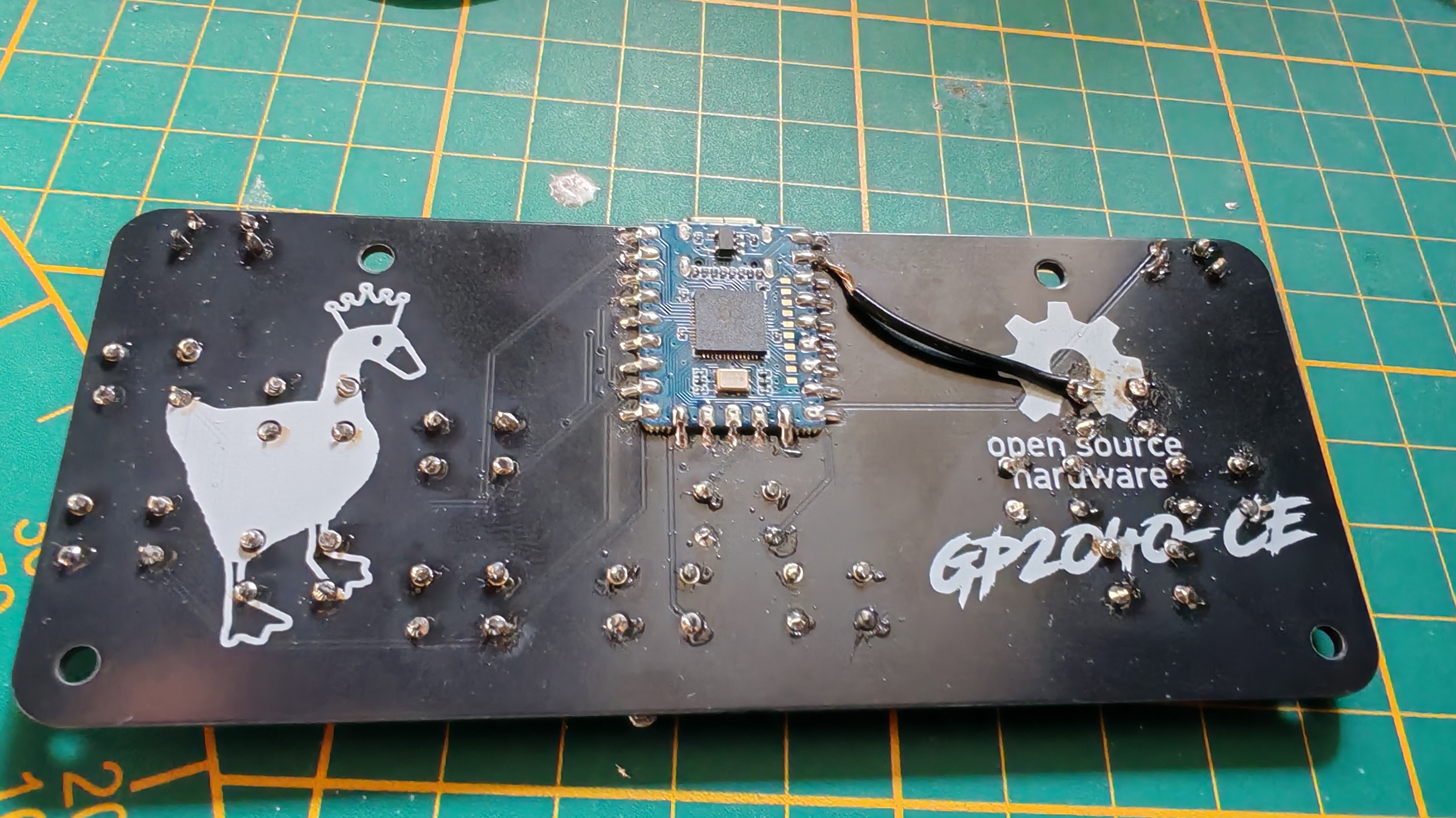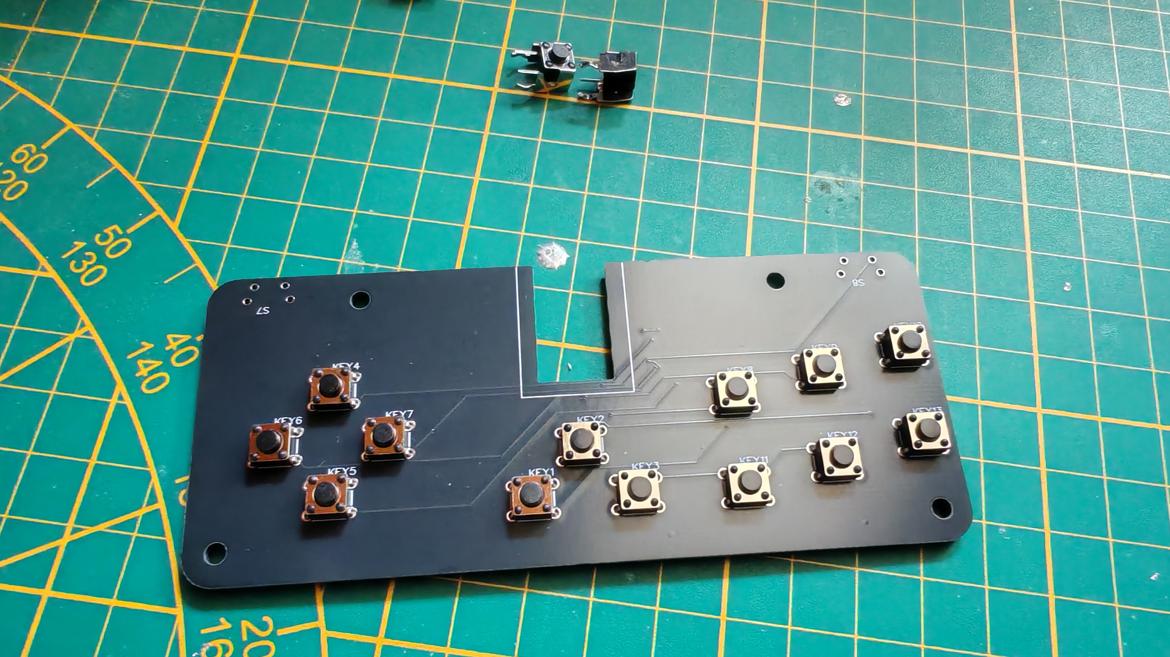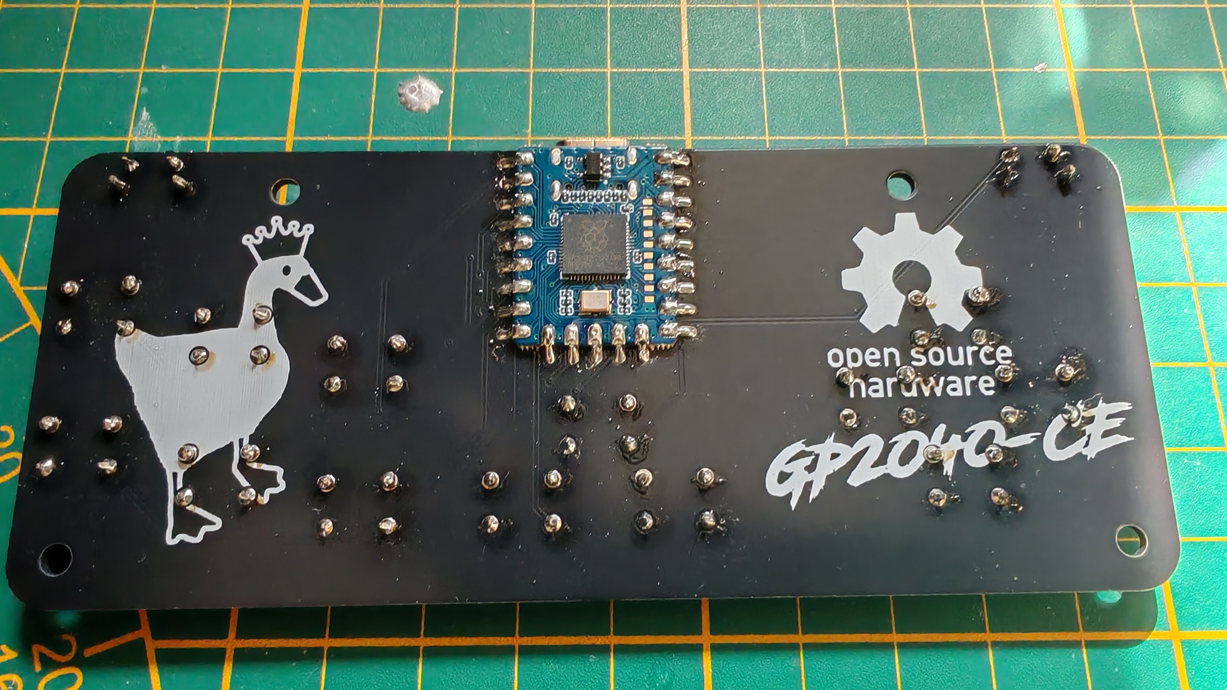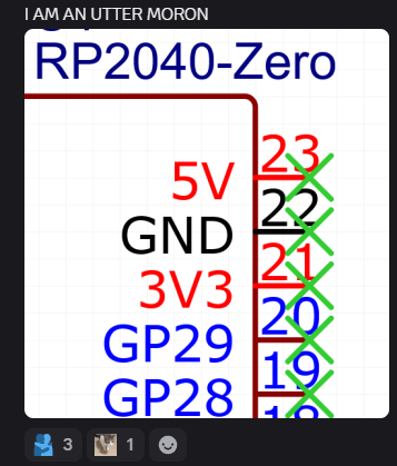J'ai pas fait de carte éléctronique depuis un moment, et pour des raisons économiques j'ai décidé d'y embarquer un RP2040-Zero, monté à l'envers, pour économiser un max sur les coûts de fabrication1. Les RP2040-Zero sont assez peu chers, donc pour moi en tant que petit artisan hobbyiste ça vaut grave le coup (et le coût). Si t'as envie de faire ça de manière chiante, rien ne t'empêche d'imprimer une platine de montage en 3D et de router manuellement tous les switches !